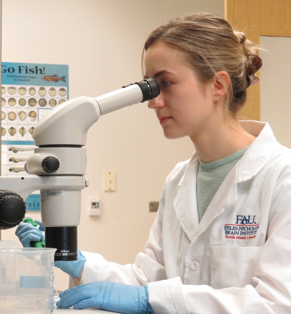 Hannah is a student in FAU’s Neuroscience Graduate Program, interested in utilizing genetic tools to advance understanding of nervous system development and repair. Her scientific journey began in marine biology, but a growing fascination with neurological injuries led her to psychology and ultimately to neuroscience. Now, she’s come full circle working with the Danio rerio model!